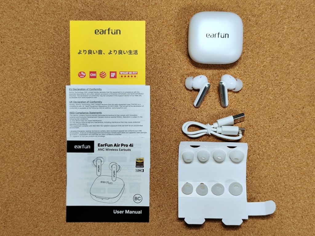 パッケージの内容は、本体、イヤーピース5種類(Mサイズ相当が本体に装着済)、充電ケース、USB-Cケーブル、マニュアル類です。