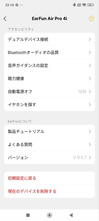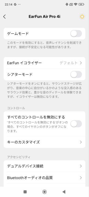 本機は「EarFun Audio」アプリに対応しています。「Earfun Audio」アプリでは、ノイズキャンセリングの効き具合、ゲームモードON/OFF、イコライザー、シアターモードON/OFF、キーのカスタマイズ、LDACのON/OFF(Androidの場合のみ)等のコントロールができます。