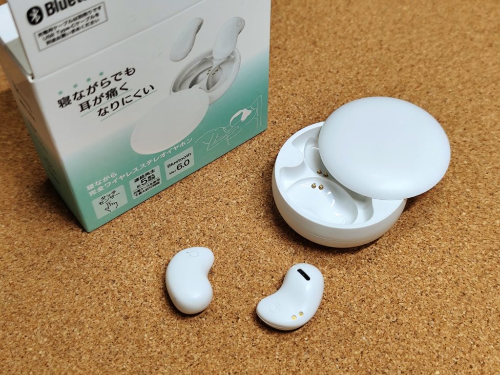 特長はその形状で、他の寝ホンによくあるカナル型ではなくオープンイヤー型で、突起などはなく、ソラマメや勾玉のような形をしています。