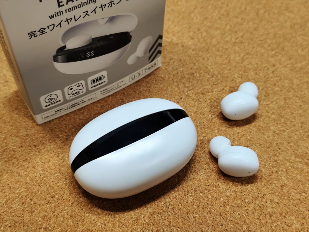 2025年の年末くらいにダイソー店頭で見つけたのが今回レビューする「完全ワイヤレスイヤホン(残量表示付)No.7468」です。