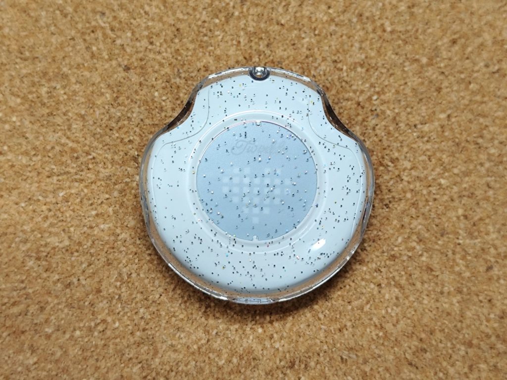 ラメが入ったクリア素材で覆われた円形で、かわいくて持ちやすい形状です。