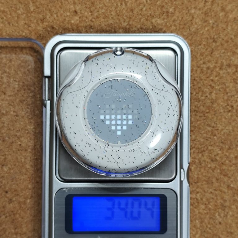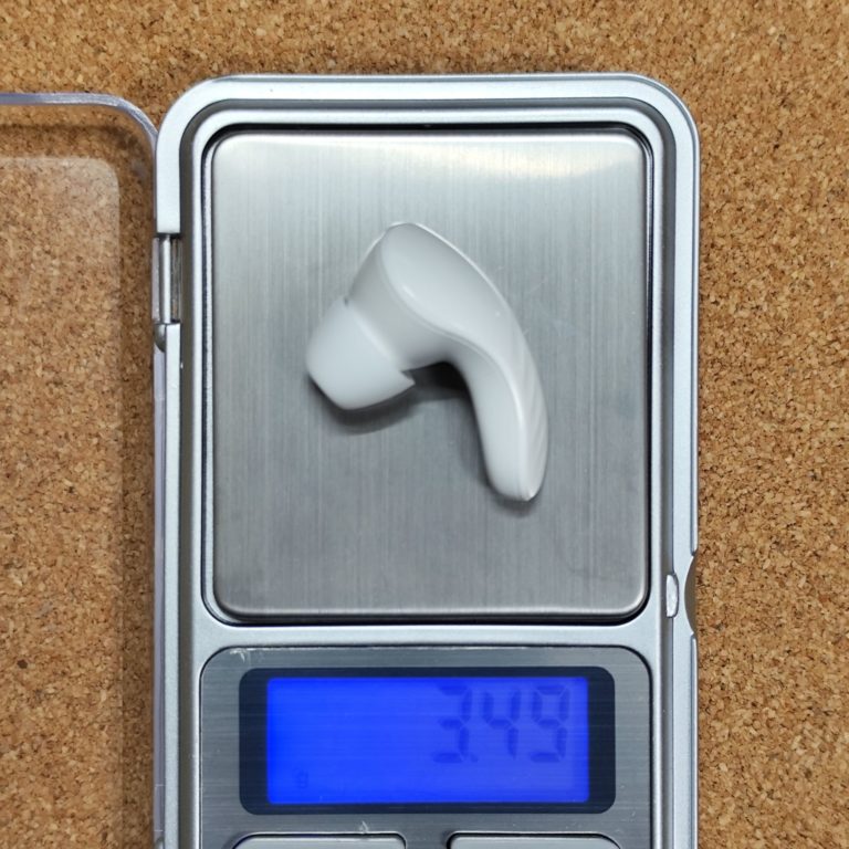 充電ケースの直径はおよそ52mm、厚みは22.9mmといったところです。本体収納時の重量は約34g。やや軽いといったところです。