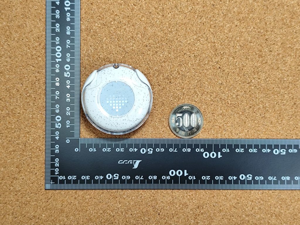 本体の高さは34mm、厚みは最大15.8mmといったところ。500円玉と比べると、本体のサイズは少し大きいことがわかります。本体重量は約3.5g。大きさのわりには軽めです。